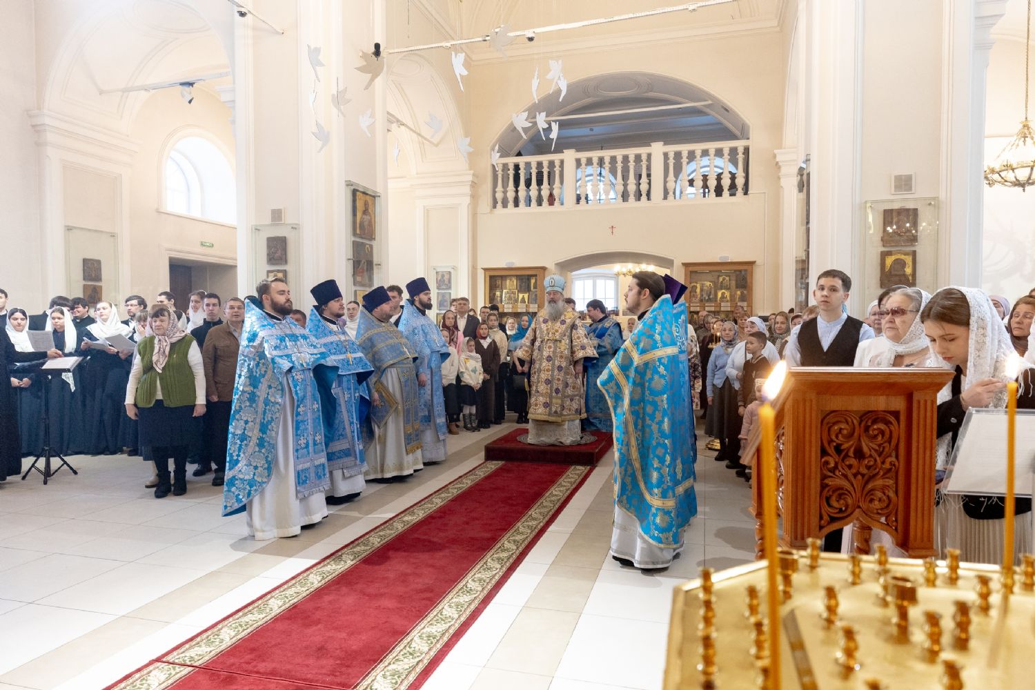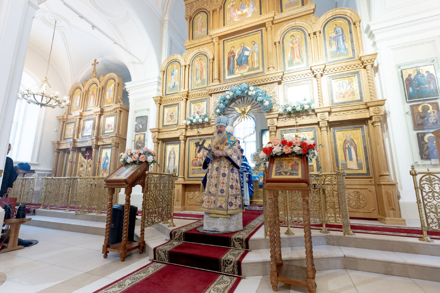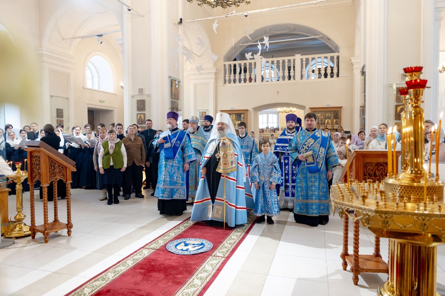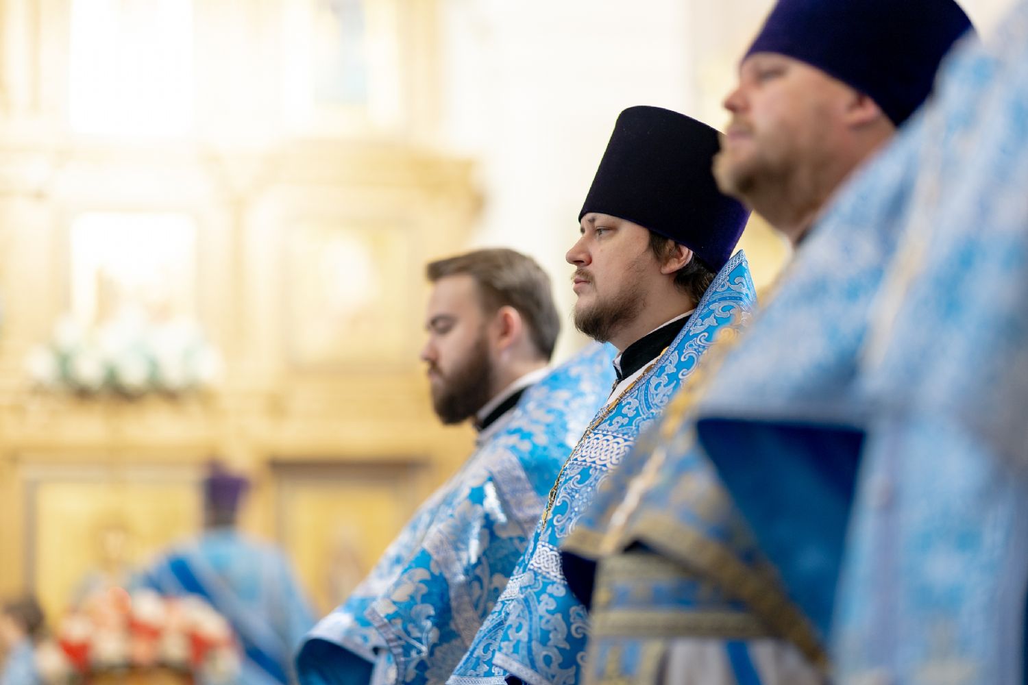 Его Высокопреосвященству сослужили благочинный I округа города Казани протоиерей Владимир Самойленко, ректор Казанской духовной семинарии иерей Никита Кузнецов, настоятель Сергиевского храма иерей Артемий Лушкин, клирик храма благоверного князя Александра Невского города Казани протоиерей Сергий Хохлов, ключарь Благовещенского собора Казанского кремля иерей Виктор Бельских, настоятель Спасо-Евдокиевского храма города Казани иерей Димитрий Аликин, клирик Воскресенского собора города Тутаева (Рыбинская епархия) иерей Евгений Дворников, клирик архиерейского подворья Московских святителей города Казани иерей Артемий Серов, клирик храма преподобного Серафима Саровского города Казани иерей Роман Ермолаев.