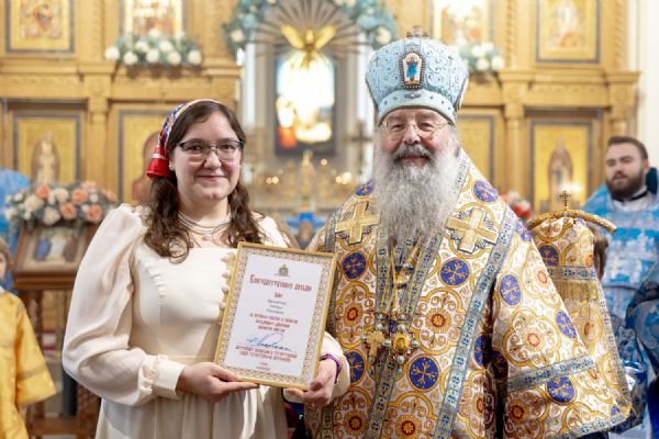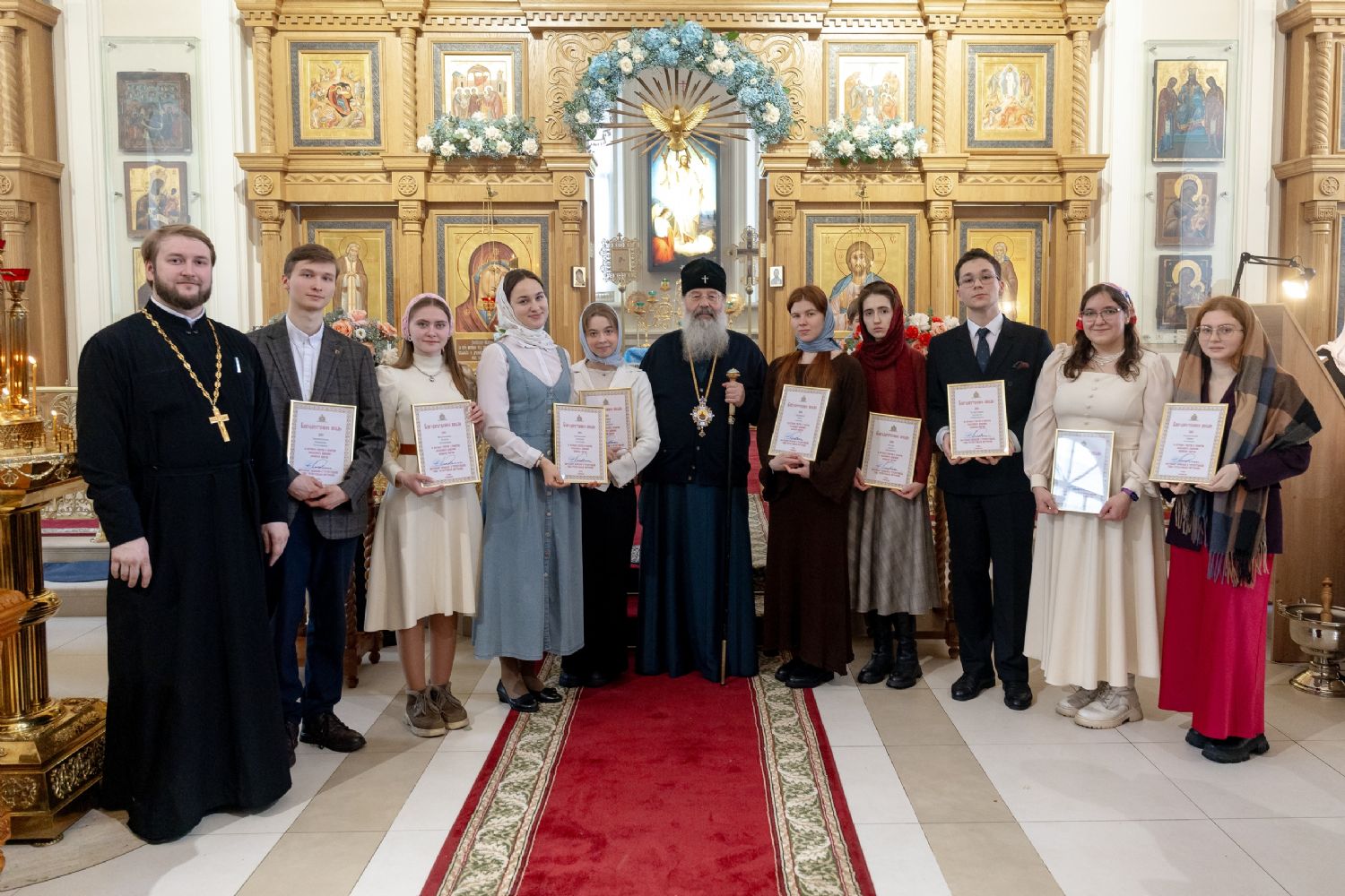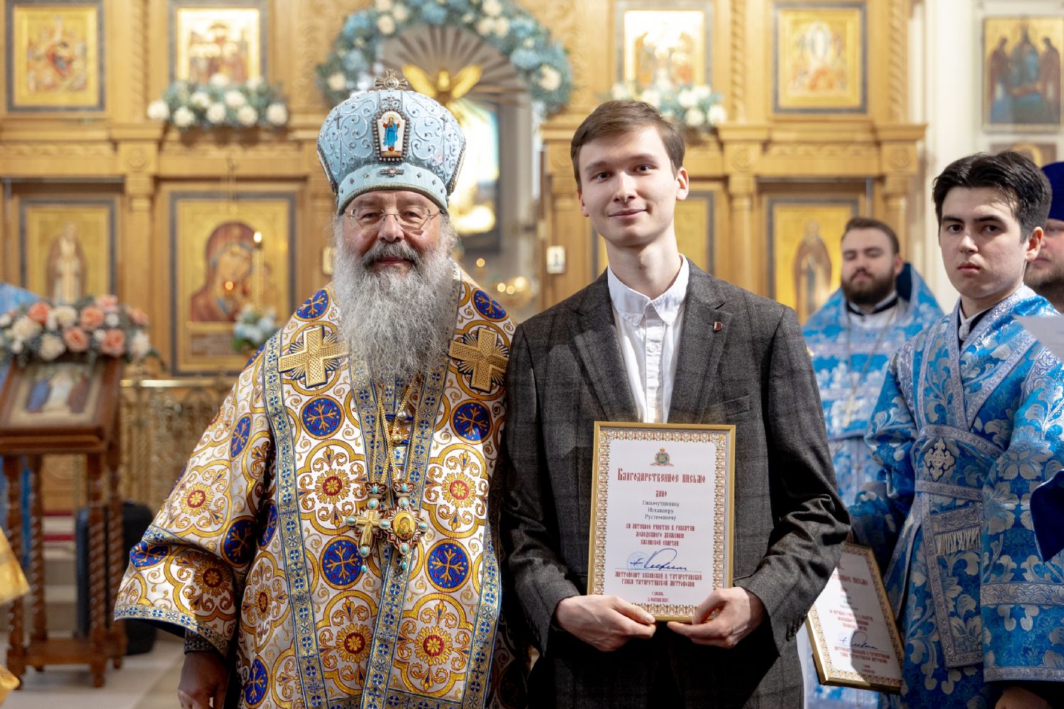 Затем состоялось награждение молодых активистов Казанской епархии. Благодарственных архиерейских писем были удостоены: Валерия Грачёва, помощник при епархиальном молодёжном отделе; Дарья Хлопцева, помощник при епархиальном молодёжном отделе; Серафим Тимергалиев, помощник благочинного I церковного округа по молодёжному служению, организатор и участник молодёжных проектов при Сергиевском храма г. Казани; Екатерина Колобынина, организатор и участник молодёжных проектов при Сергиевском храме г. Казани; Эльвира Васильева, участник молодёжных проектов при Серафимовском храме г. Казани; Ксения Шильникова, участник молодёжных проектов при Спасо-Евдокиевском храме г. Казани; Искандер (Августин) Гильмутдинов, ответственный за молодёжное движение при Новоиерусалимском подворье г. Казани; Дарья Окулко, ответственная за молодёжное движение при храме Иоанна Кронштадтского Казанской духовной семинарии; София Малишевская, ответственная за молодёжное движение при Софийском храме г. Казани.