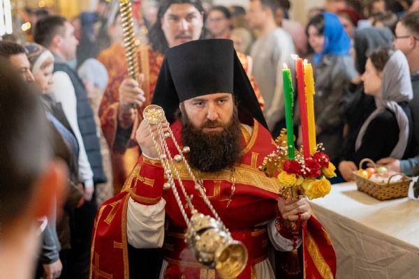 После службы священнослужители освятили пасхальную снедь. Участникам архиерейского богослужения были розданы праздничные открытки.