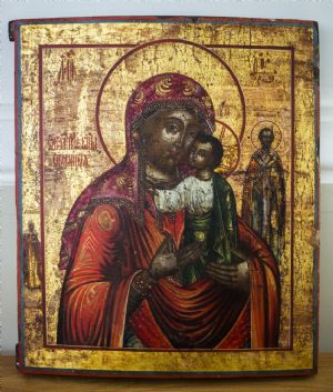 Около ста жителей окрестных деревень отправились в лес и увидели прибитый на дереве железный крест, а недалеко от него небольшую икону старинного письма. На иконе была изображена Богородица с Младенцем на руках, а по левую сторону от Нее – святитель Николай Чудотворец. Как только икону сняли с дерева, в лесу поднялся сильный шум, как бы от урагана, а над иконой появилось необычное свечение.